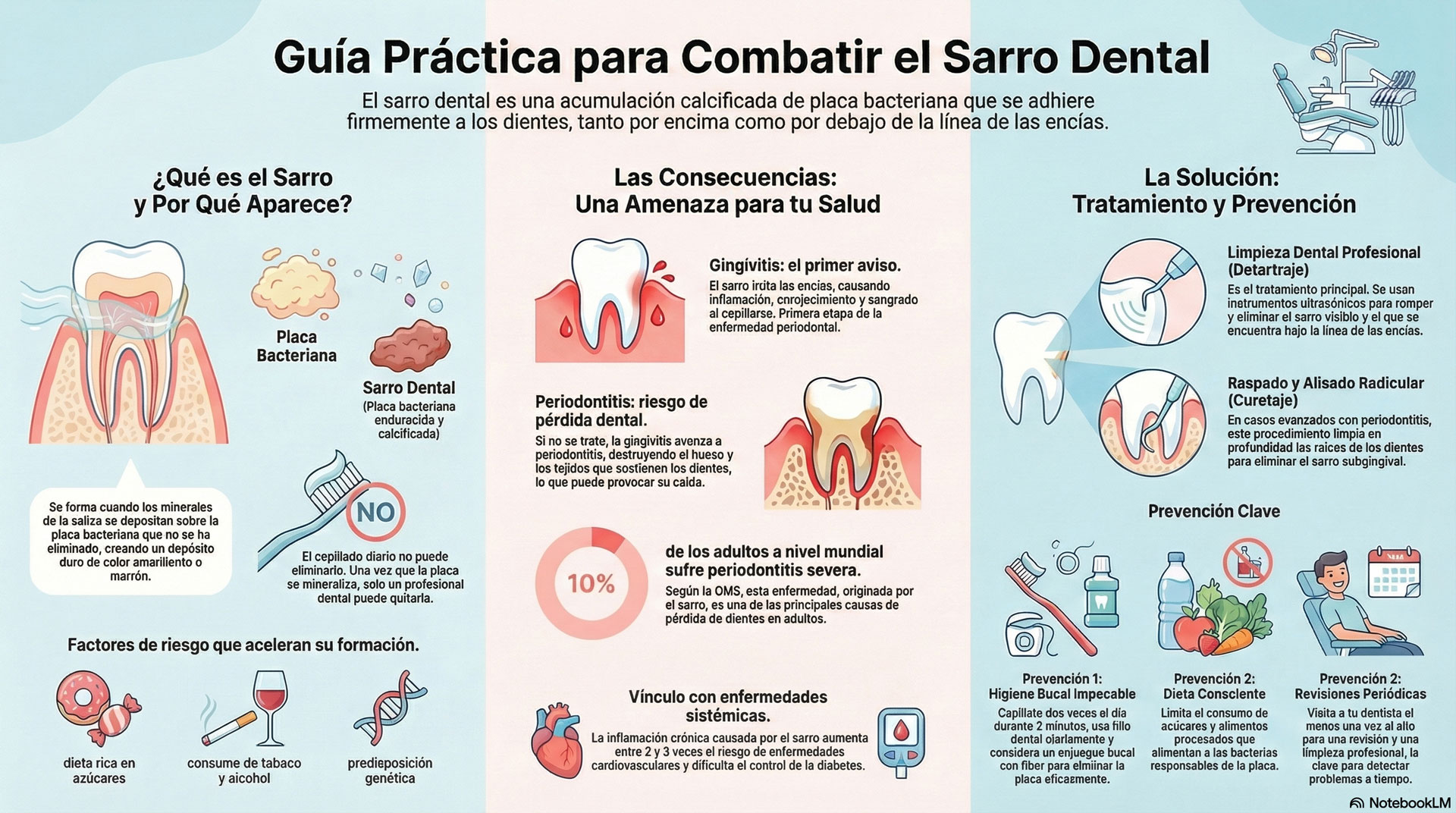 La placa bacteriana mineralizada no se elimina con el cepillado diario. Para una boca sana y protegida del sarro, una revisión y limpieza profesional es esencial.